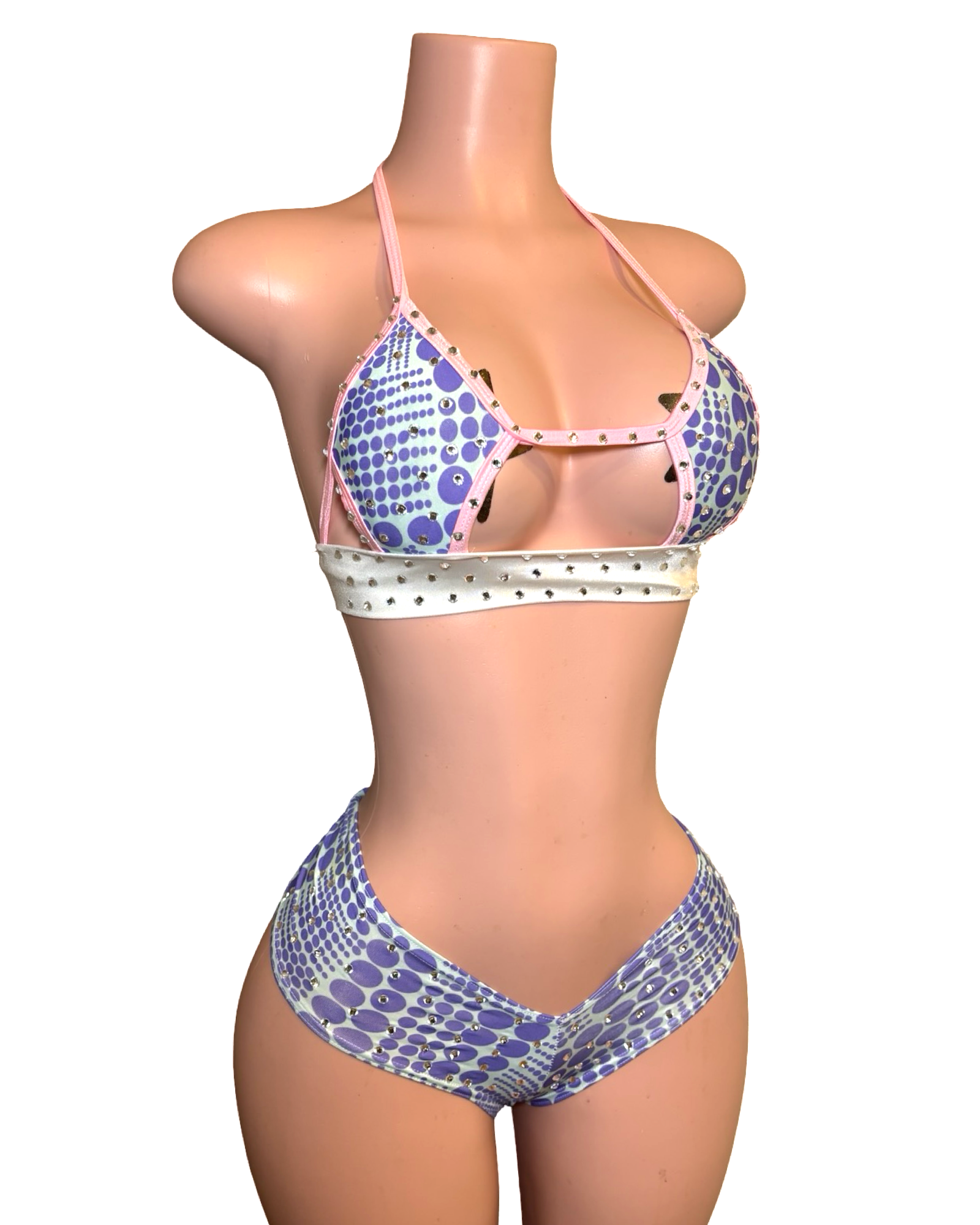 A playful yet polished two-piece featuring a blue bubble print with pink trim and rhinestone accents.